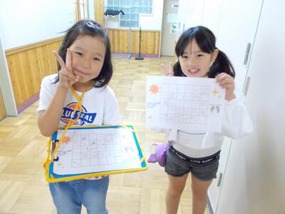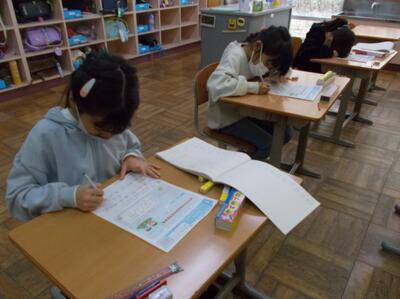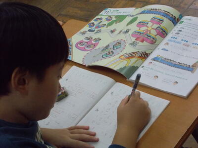 1年生は算数で、繰り下がりのある引き算の学習をしていました。「14-9=」は「4から9は引けないから…」。勉強がだんだん難しくなってきましたね。それでも根気強く取り組んでいました。