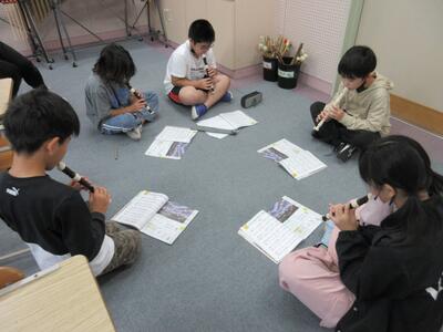 5年生の音楽では、リコーダーに取り組んでいました。かけ合いや重なりを生かして演奏しようということで、星笛という曲をグループでかけ合いながら練習をしています。タンギングなども意識しながら演奏していました。リコーダーの後は、合唱です。ハロー・シャイニング・ブルーという曲を歌いました。とっても素敵な曲で、ついつい私も一緒に歌ってしまいました…。歌っていいですね…。