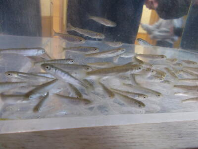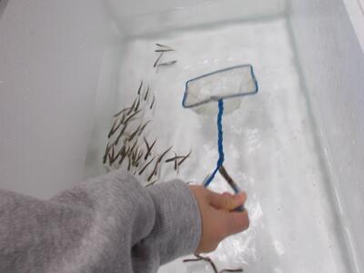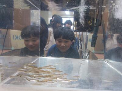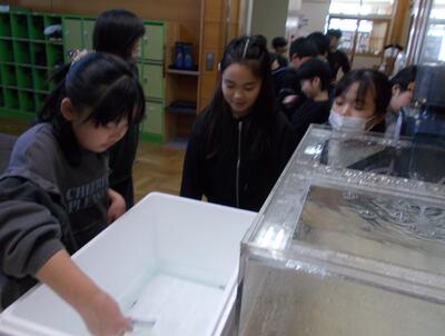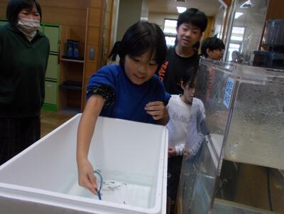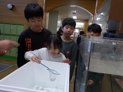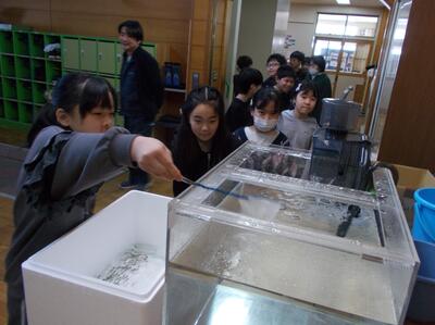 本日、サケの稚魚が搬入されました。ようこそ鴛小へいらっしゃいました。3,4年生の総合の授業で、サケを飼育し放流するまでを学びます。100匹ほどのサケの稚魚をみんなでかわるがわる水槽へと優しく移していきます。しばらくは毎日餌をやりながら育て、倍ぐらいの大きさに育つ5月ごろに放流する予定だそうです。4年後ぐらいには、自分たちが育てたサケがこの島に戻ってくるかもしれませんね…。大事に育てていきたいです。