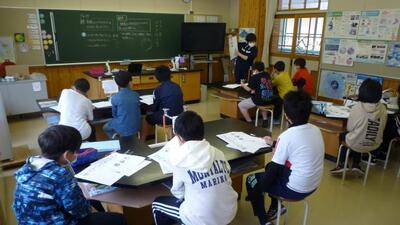 また、鴛泊中学校の加藤先生と野村先生が来校し、算数のTTや少人数指導の授業を行っています。これも教科担任制の一つです。