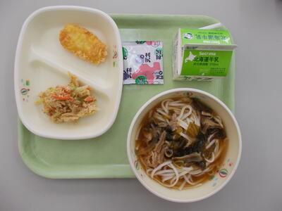 島っこうどん イカの天ぷら キャベツとささみの胡麻酢和え 牛乳