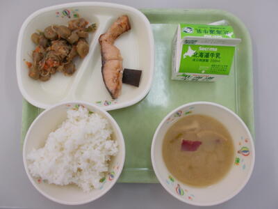 白飯 さつまいも味噌汁 鮭の幽庵焼き 鶏ごぼう炒め 利尻昆布 牛乳