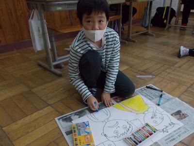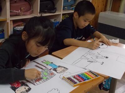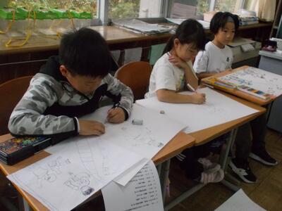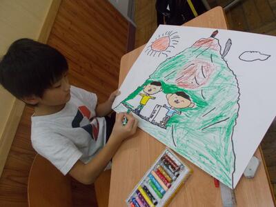 2年生は図工で絵を描いていました。自分が思い出に残っている出来事を思い出しながら、想像力豊かにクレヨン等を使って描いています。動物園に行ったこと、利尻登山をしたこと、バーベキューや自転車など、思い思いの出来事を画用紙いっぱいに上手に描いていました。