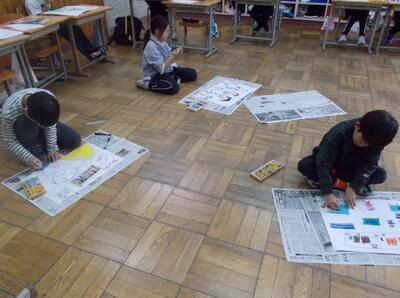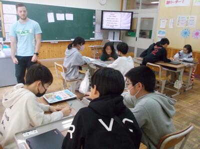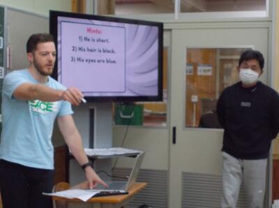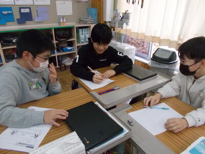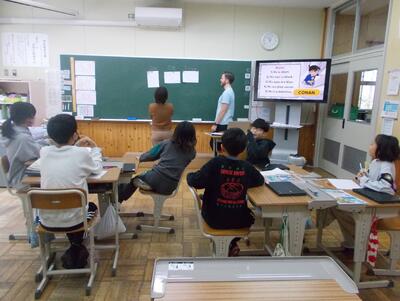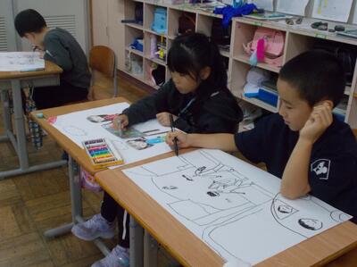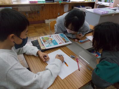 5年生は外国語の授業です。ALTから英語でクイズが出されます。あるキャラクターに関わるヒント(髪の毛の色、好きなものなど…)を出されて、そのキャラクターが誰なのかをイラストで表現します。英語が分からないと誰なのかイメージができないのですが、子どもたちは班で意見を出し合いながら考えて、楽しみながら英語に親しんでいました。