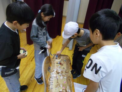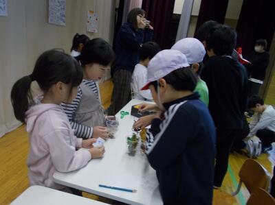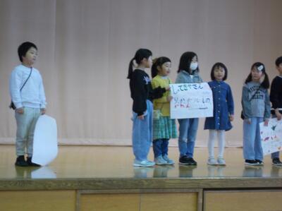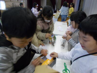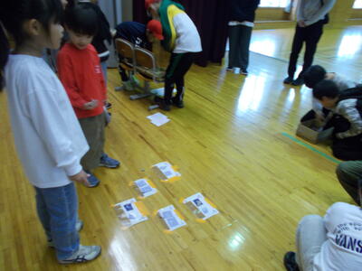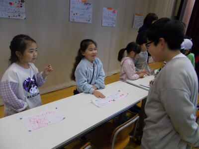 また、1年生の発表では、「中休みに体育館でお店を開くので、ぜひ遊びに来てください。」と呼びかけがありました。中休みは、たくさんのお兄さんお姉さんがお店の前に並び、1年生が準備をした遊び(射的やどんぐりころがし)など、それぞれのお店で楽しんでいました。1年生の皆さん、素敵なお店をありがとう!
