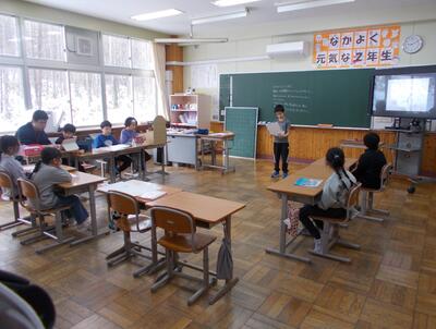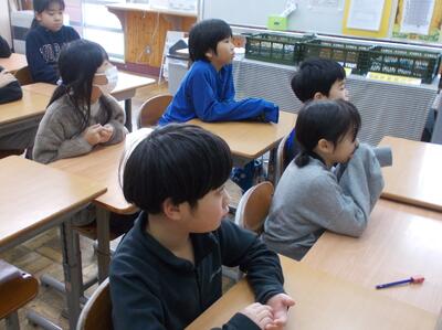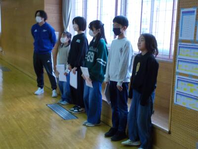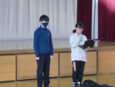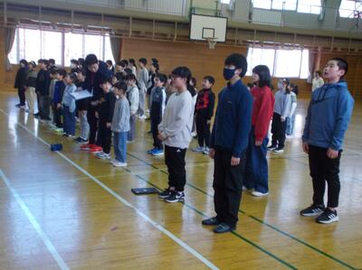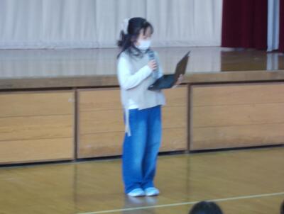 全校集会では、児童会代表が冬休みの様子や今学期に頑張りたいことを発表し、みんなで仲良く楽しく過ごし、さまざまなことに挑戦していこうと呼びかけました。また、放送委員会からは、リクエストボックス再開のお知らせもありました。