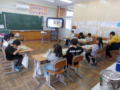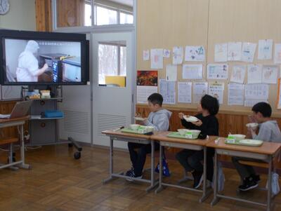 今週一週間は、全国学校給食週間として「みんなでいこう!給食センターツアー☆」の取り組みを行っています。給食センター内の動画を見て、給食ができるまでに興味をもってもらったり、作ってくれる人に感謝して食べようとする気持ちを育んだりできるように、給食センターの方々が発信してくれています。今日は、「ごはんができるまで」についての動画配信があり、利尻島内全部の学校のために作られる大量のごはんや大きな機械などが紹介され、2年生の教室では「へぇ~、そうなんだぁ」などと興味深そうに見ながら、給食をおいしくいただいていました。明日以降もお味噌汁やラーメンのできるまでなどが紹介されるようです。楽しみですね…。