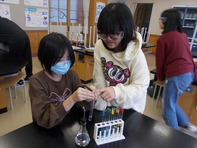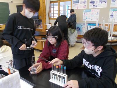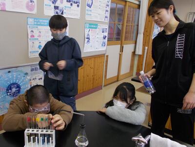 6年生は理科で、炭酸水の中には二酸化炭素が含まれているのかを調べる実験を行っていました。「あ、白く濁ってきた~!」などと変化に気づきながら知識を身に付けていました。