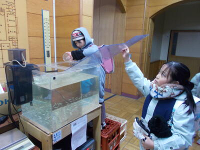 さけの稚魚は、元気に成長中。来た時よりもほんの少し大きくなっているように感じます。3,4年生が当番制で、朝・昼・帰りに責任をもってえさをあげています。これからの成長も楽しみですね…。