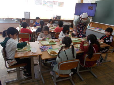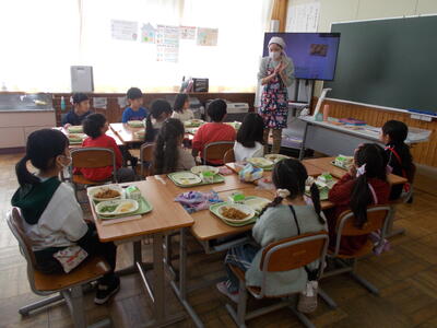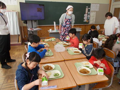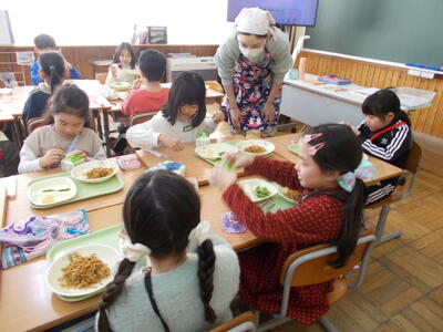 栄養教諭が来校し、1年生の給食指導を行ってくださいました。盛り付けや配膳の様子を見守っていただいた後、食べる前には「栄養をしっかりとるために、少しでも多く食べる練習をしていきましょう」「苦手なものも、一口からでよいので挑戦していきましょう」とお話がありました。今日はミルメークの日。牛乳に入れる際には苦戦する様子も見られましたが、楽しみながらおいしくいただくことができました。また、焼きそばやポンデケージョも大人気で、子どもたちは笑顔で給食の時間を過ごしていました。
