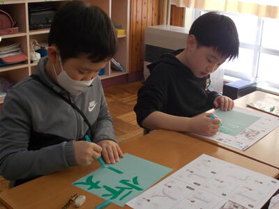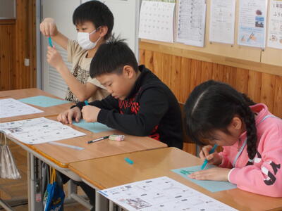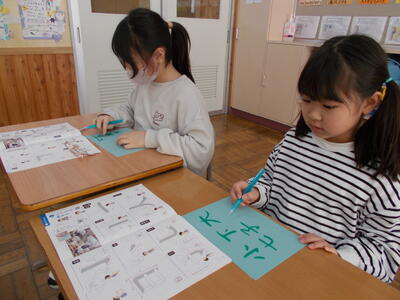 2年生が書写の授業に取り組んでいました。水筆(みずふで)を使い、毛筆の練習を行っています。初めて使う水筆に、子どもたちは興味津々。書いた文字がだんだん消えていくため、「何回も練習できる!」と嬉しそうに筆を動かしていました。一画一画を丁寧に書こうとする姿が見られ、どの子も真剣に取り組んでいました。この1年間、日頃から丁寧に字を書くことを意識してきた成果もあり、子どもたちの字はぐんぐん上達しています。