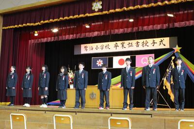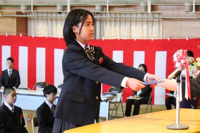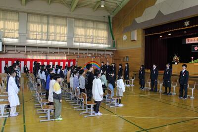 たくさんのご来賓の皆様にご参列いただき、卒業証書授与式を滞りなく執り行うことができました。9名の卒業生一人一人に、心を込めて卒業証書を手渡しました。卒業生は、これまでの成長を感じさせる堂々とした姿で式に臨んでいました。在校生による元気な呼びかけと心を一つにした全校合唱、そして卒業生の感謝の言葉と合唱は、どれも思いのこもった素晴らしいものでした。会場全体が温かな空気に包まれ、心に残る式となりました。卒業生の皆さんのこれからのご活躍を心より願っております。そして卒業生を支えてくださった保護者の皆様、地域の皆様、これまで本当にありがとうございました。