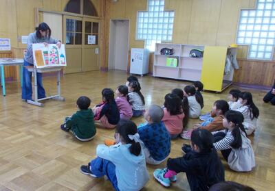 大型の絵本の読み聞かせ。みんな夢中です。