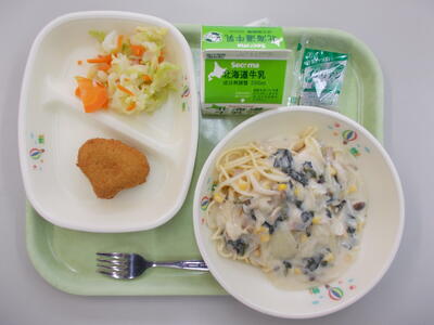 クリームスパゲティ 焼き栗コロッケ キャベツニンジンサラダ ドレッシング 牛乳