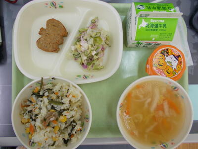白飯 キャベツ味噌汁 サーモンフライ 醤油 秋の五目うま煮 牛乳