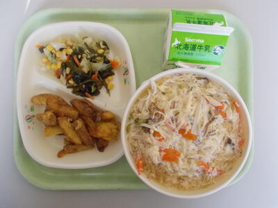 かき玉にゅう麺 スパイシーポテト 海藻サラダ 牛乳