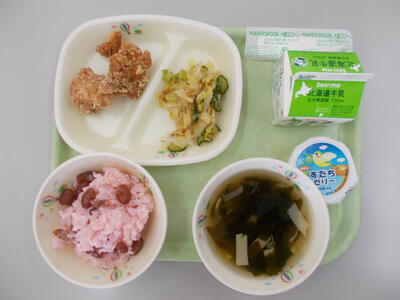 赤飯 若竹汁 手作り鶏唐揚げ キャベツ梅肉和え 卒業巣立ちゼリー 牛乳