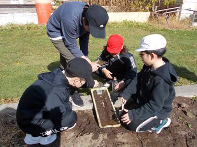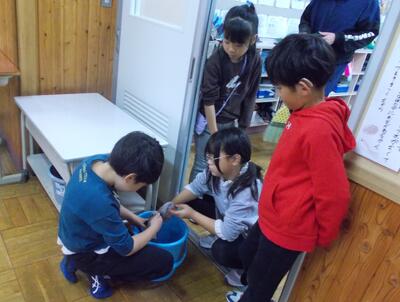 5年生は、川の上流・中流・下流の様子を実験で再現しながら、水の勢いや土の流れの違いを観察していました。実験方法を自分たちで考え、実際にやってみて、そこから多くの発見をしている姿がとても頼もしく感じられました。また、脱いだ上靴がきちんと揃えられて置かれており、こうした日常の中での心の育ちにも、思わず感心させられました。
