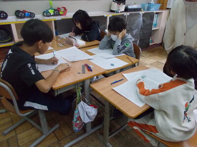 5年生は外国語の授業です。ALTから英語でクイズが出されます。あるキャラクターに関わるヒント(髪の毛の色、好きなものなど…)を出されて、そのキャラクターが誰なのかをイラストで表現します。英語が分からないと誰なのかイメージができないのですが、子どもたちは班で意見を出し合いながら考えて、楽しみながら英語に親しんでいました。