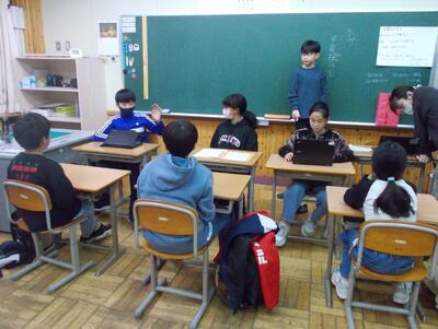 5年生は、ミニディベートに向けて、賛成・反対それぞれの立場から意見を考え、伝える力を養っていました。